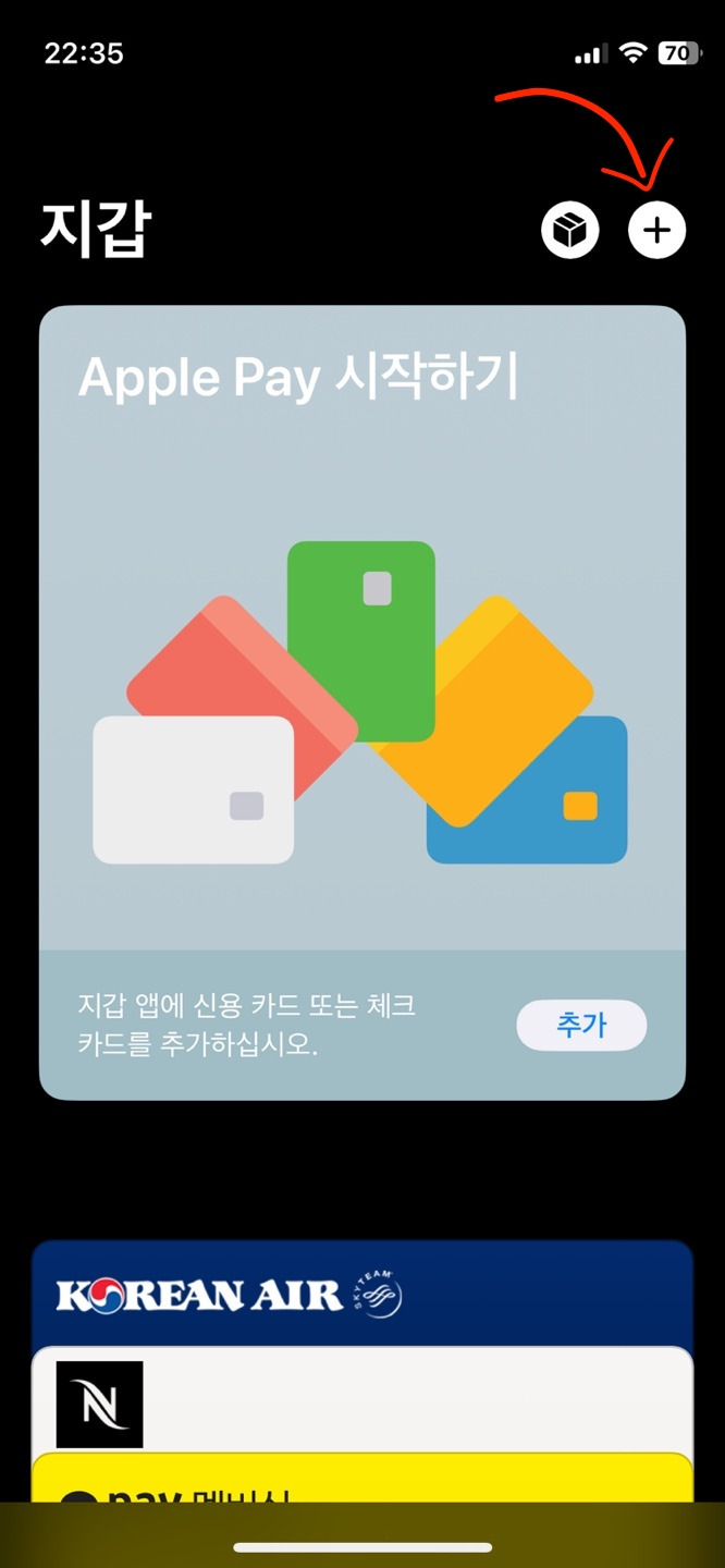 오른쪽 상단 + 버튼으로 지갑 앱에 카드를 추가하거나, 설정에서 지갑 > 카드 추가를 선택합니다.